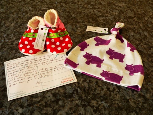El siguiente paquete llegó de más cerca, esta vez de parte de Naii. Un pijama simplemente precioso para la peque, una nota-mariposa ¡adoro sus notas de origami!, un buen trozo de antideslizante para las zapatillas de mis chicos, y una bolsita con pequeños botones decorativos que a dos de por aquí los dejaron ojipláticos